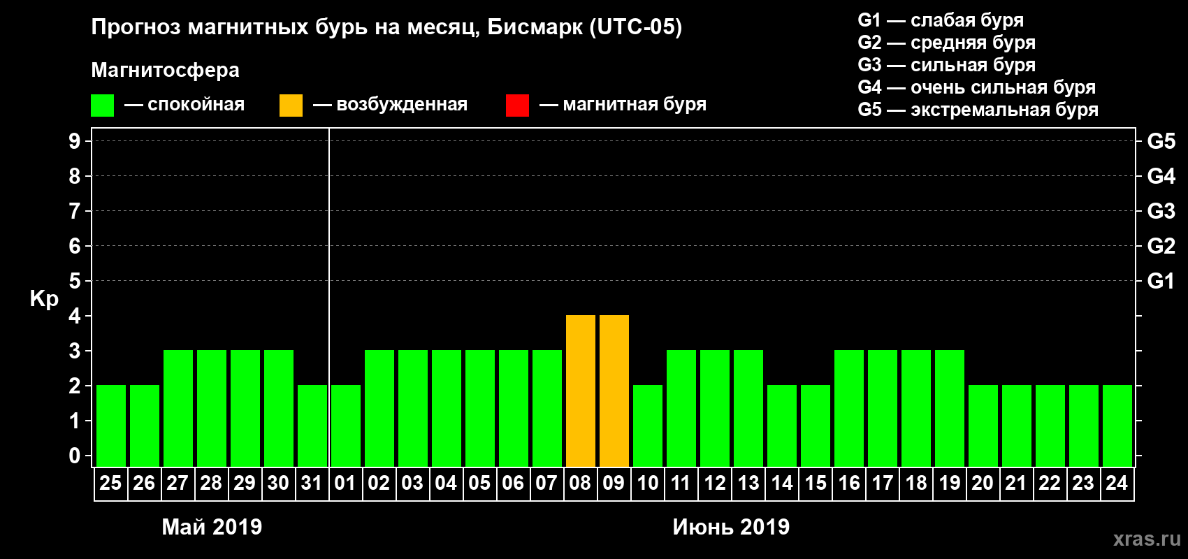 Прогноз магнитных бурь в Бисмарке — 25 мая 2019 года