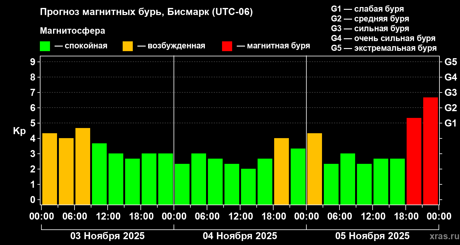 Прогноз магнитных бурь в Бисмарке — 3 ноября 2025 года