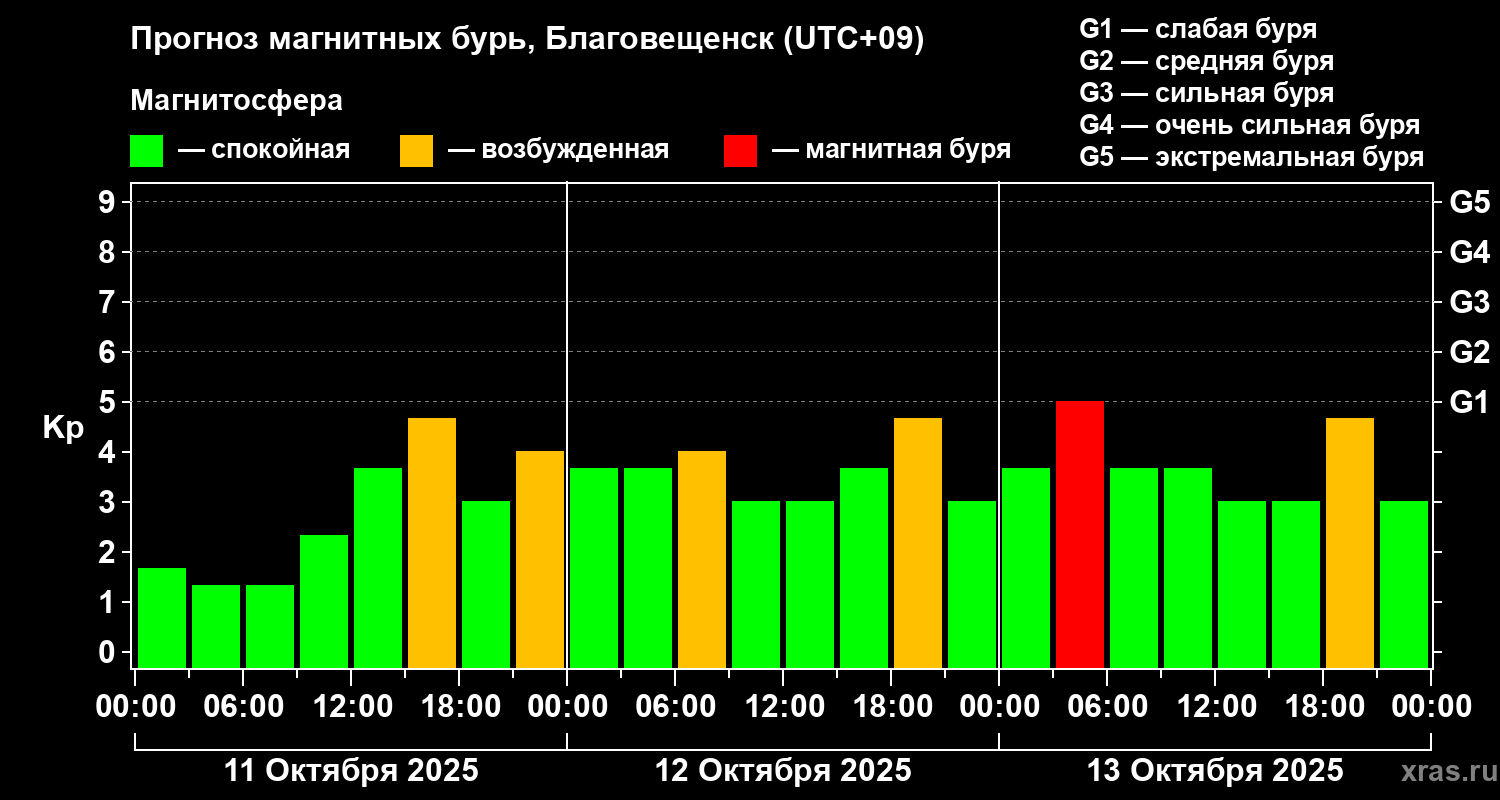 Прогноз магнитных бурь в Благовещенске — 11 октября 2025 года
