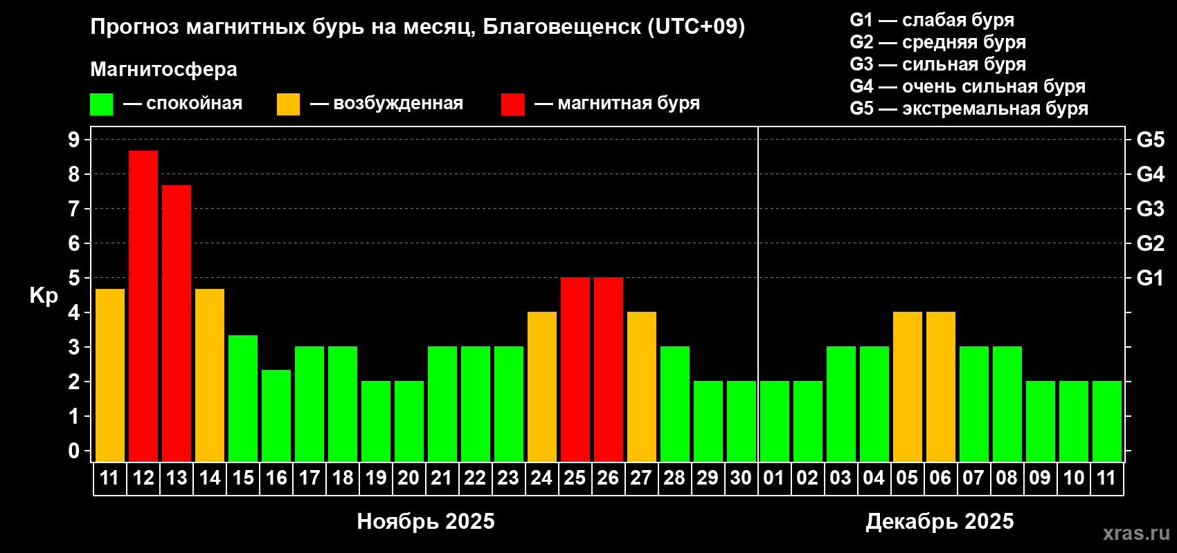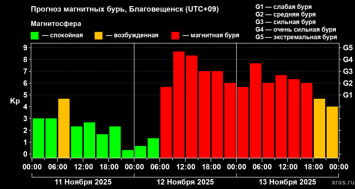Прогноз магнитных бурь в Благовещенске — 11 ноября 2025 года