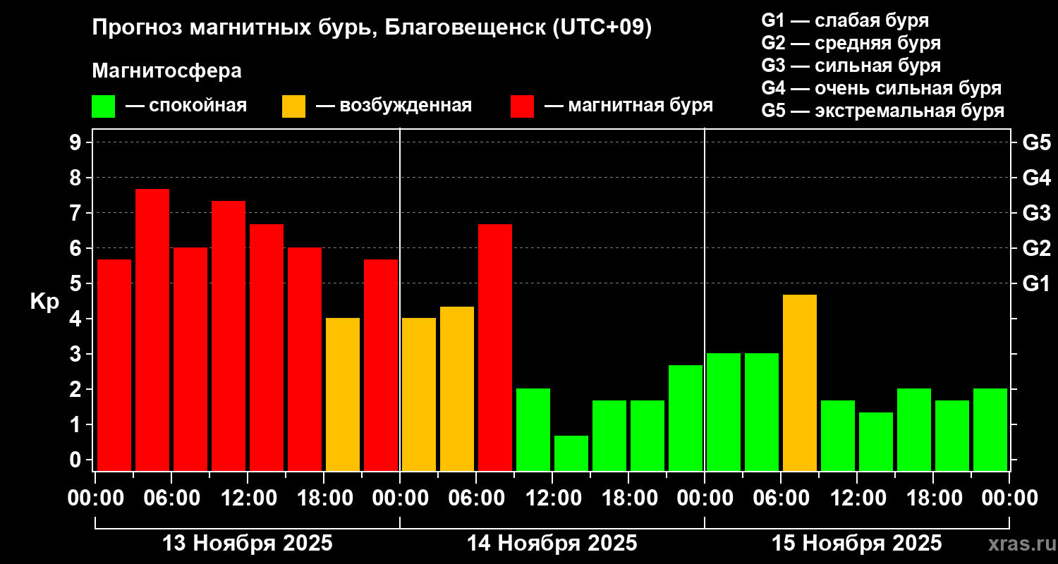 Прогноз магнитных бурь в Благовещенске — 13 ноября 2025 года