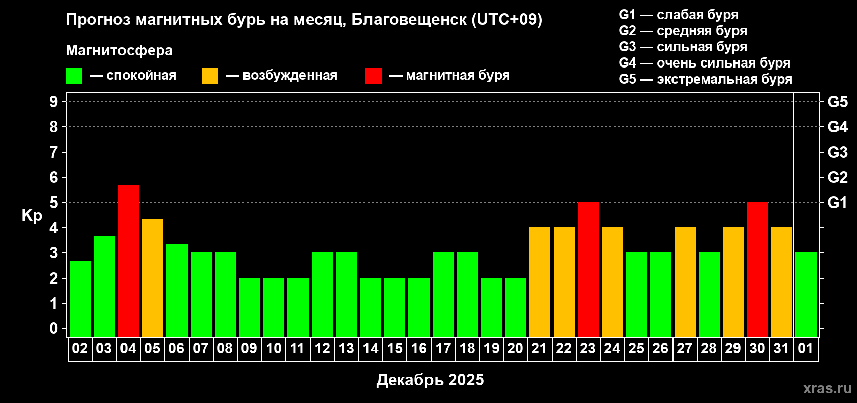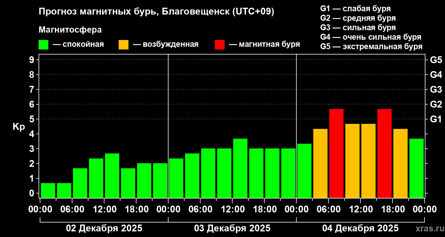 Прогноз магнитных бурь в Благовещенске — 2 декабря 2025 года