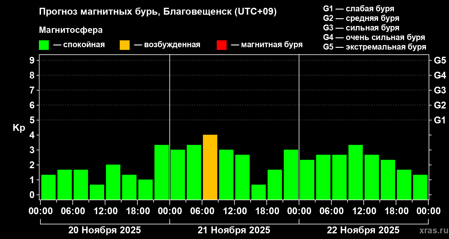 Прогноз магнитных бурь в Благовещенске — 20 ноября 2025 года