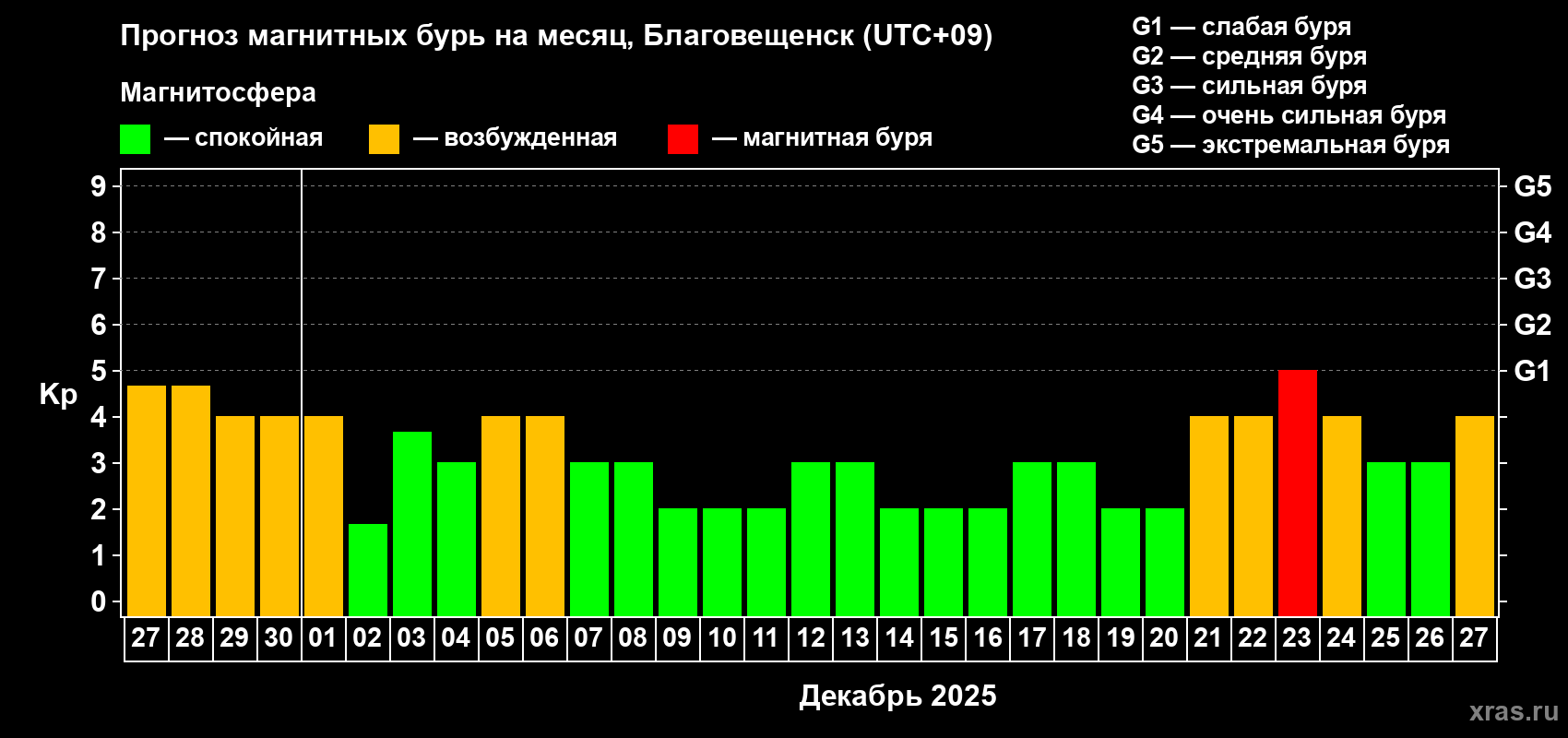 Прогноз магнитных бурь в Благовещенске — 27 ноября 2025 года