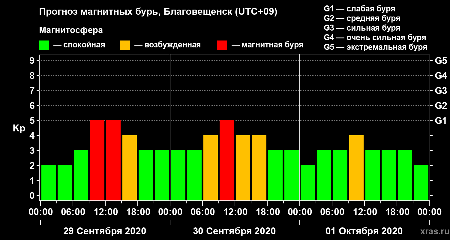 Прогноз магнитных бурь в Благовещенске на 29 сентября 2020 года