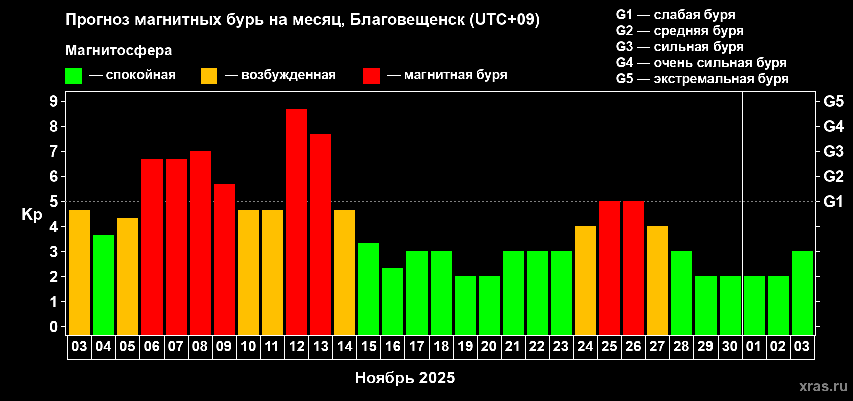 Прогноз магнитных бурь в Благовещенске — 3 ноября 2025 года