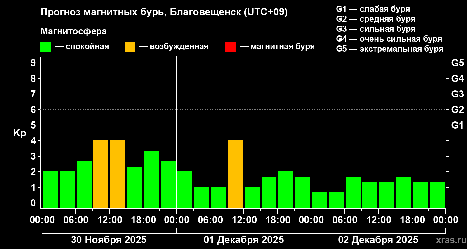 Прогноз магнитных бурь в Благовещенске — 30 ноября 2025 года