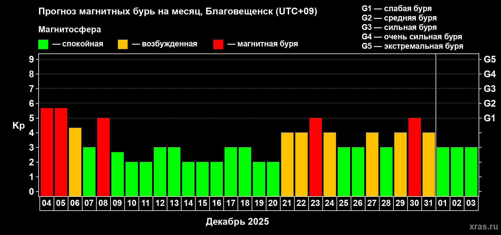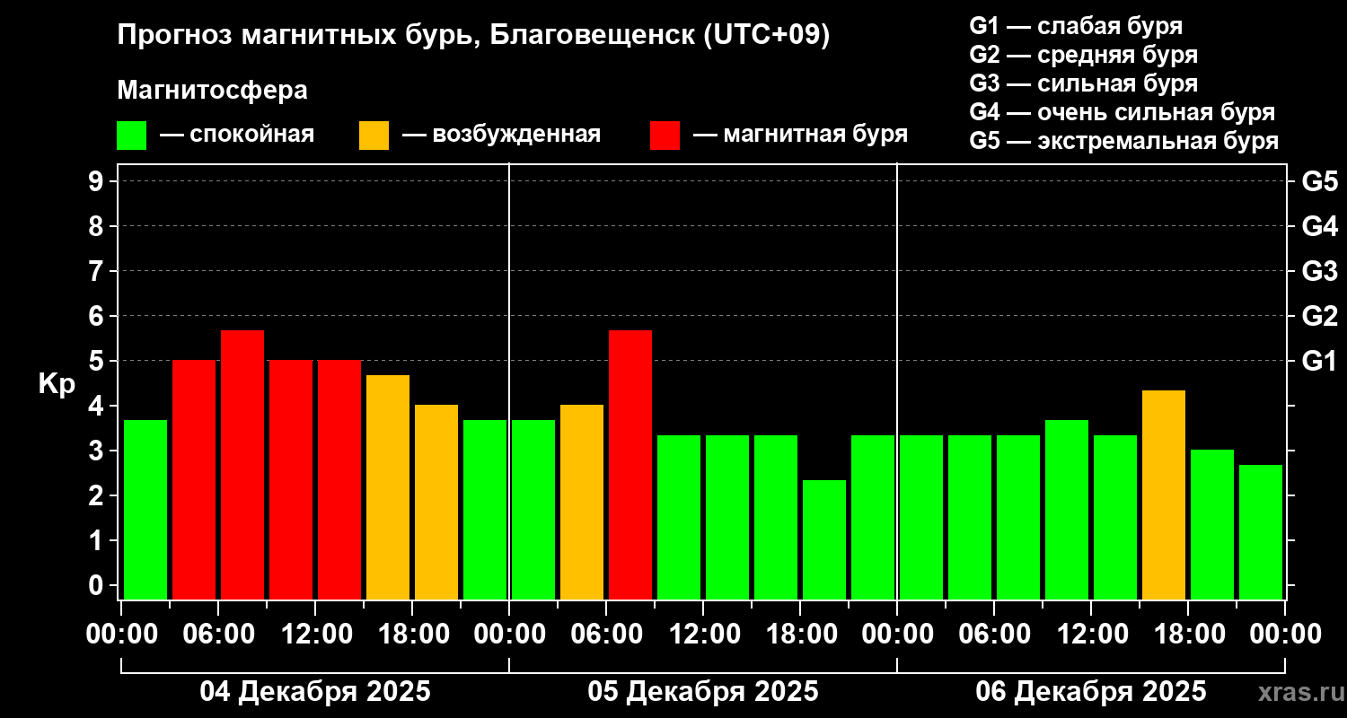 Прогноз магнитных бурь в Благовещенске — 4 декабря 2025 года