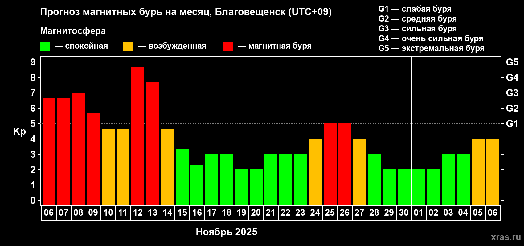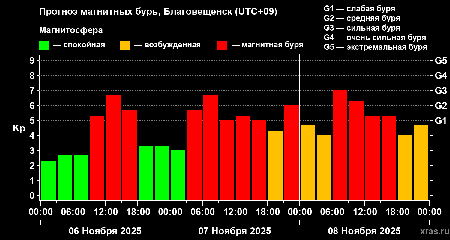 Прогноз магнитных бурь в Благовещенске — 6 ноября 2025 года