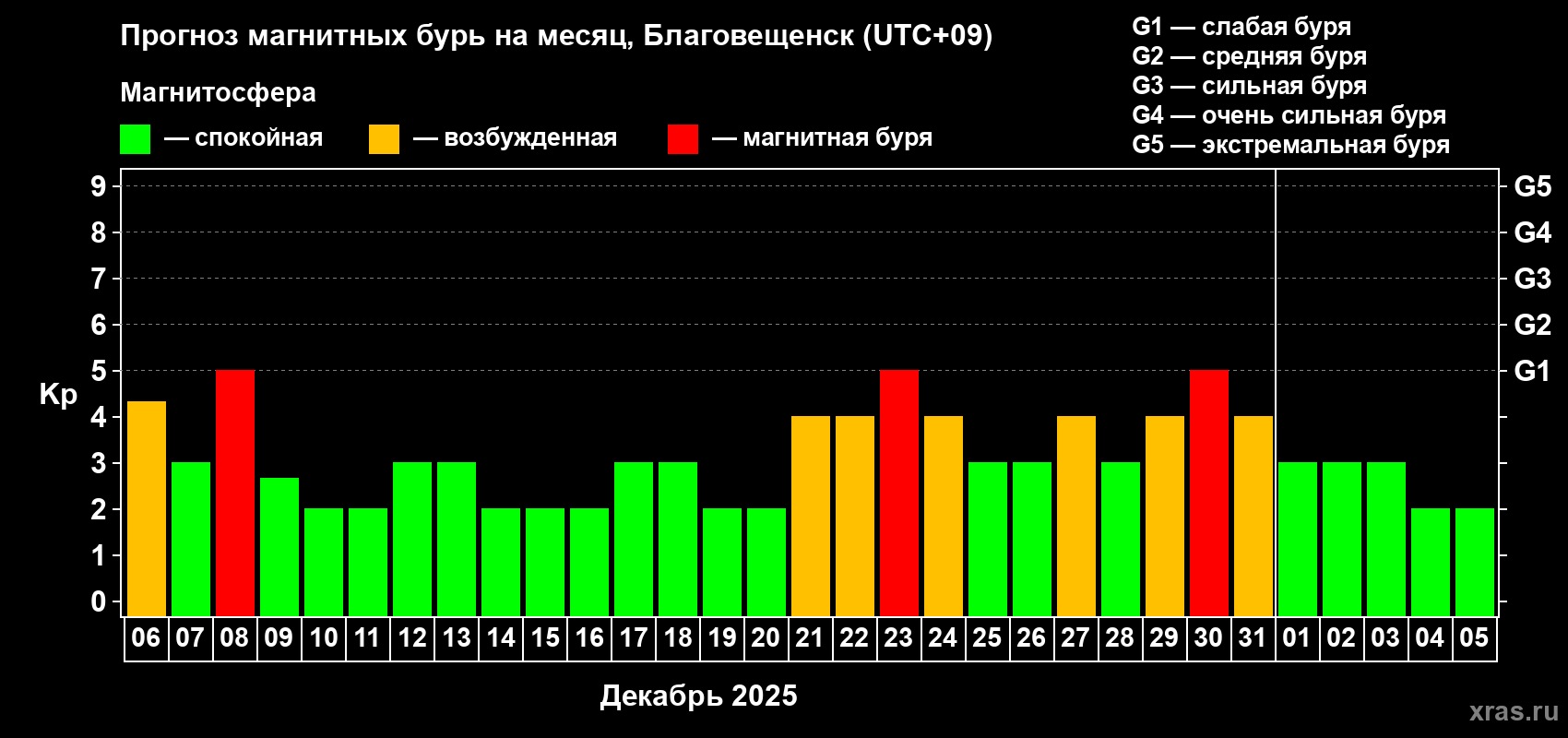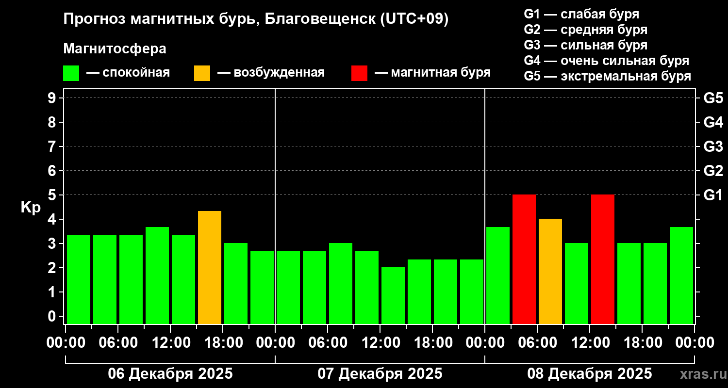 Прогноз магнитных бурь в Благовещенске — 6 декабря 2025 года