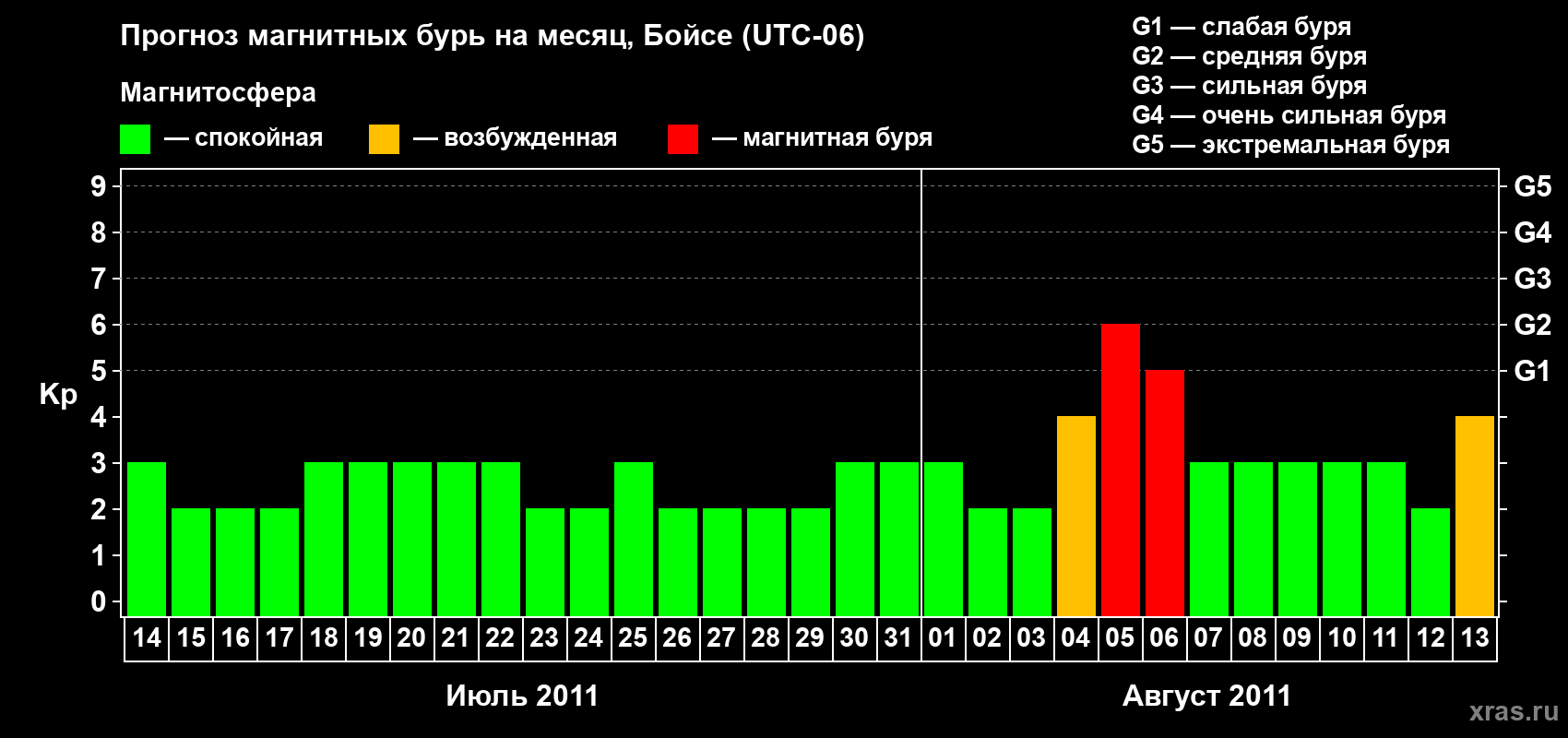 Прогноз магнитных бурь в Бойсе на 14 июля 2011 года