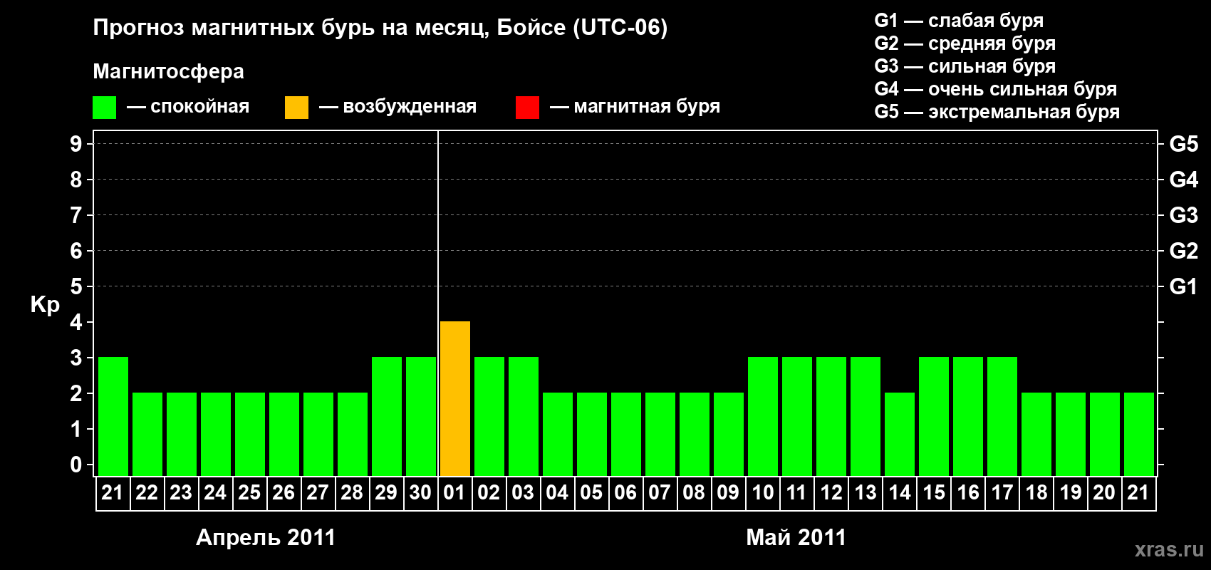 Прогноз магнитных бурь в Бойсе на 21 апреля 2011 года