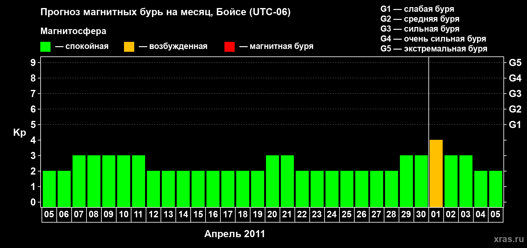 Прогноз магнитных бурь в Бойсе на 5 апреля 2011 года
