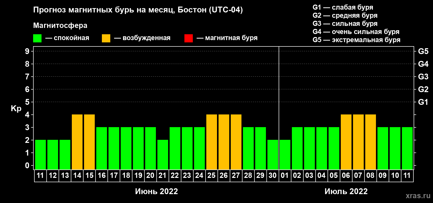 Прогноз магнитных бурь в Бостоне на 11 июня 2022 года