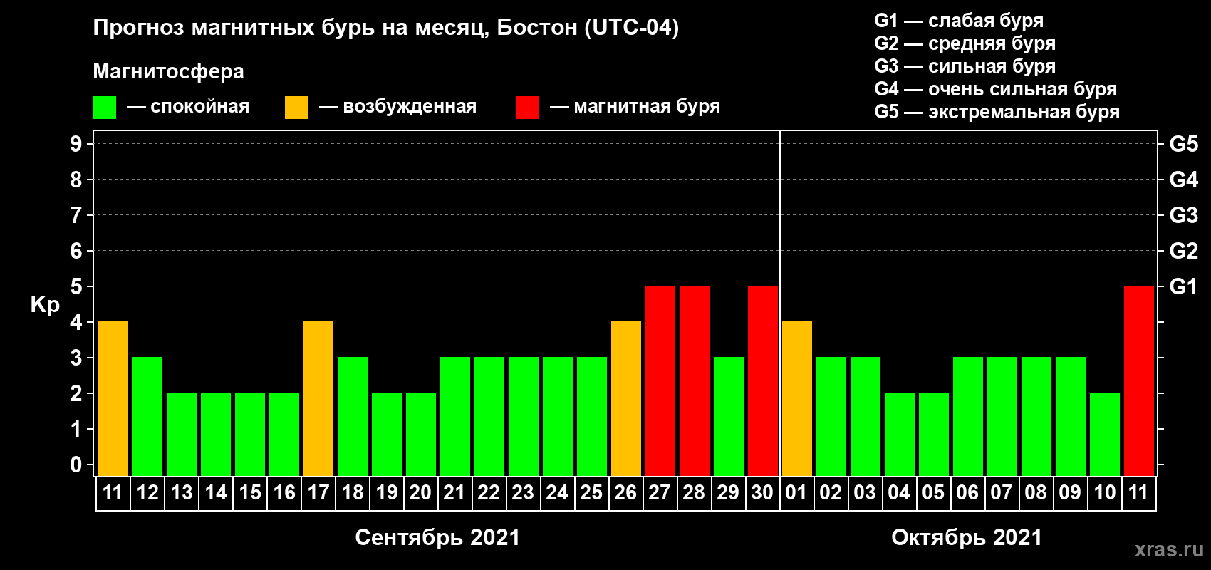 Прогноз магнитных бурь в Бостоне — 11 сентября 2021 года