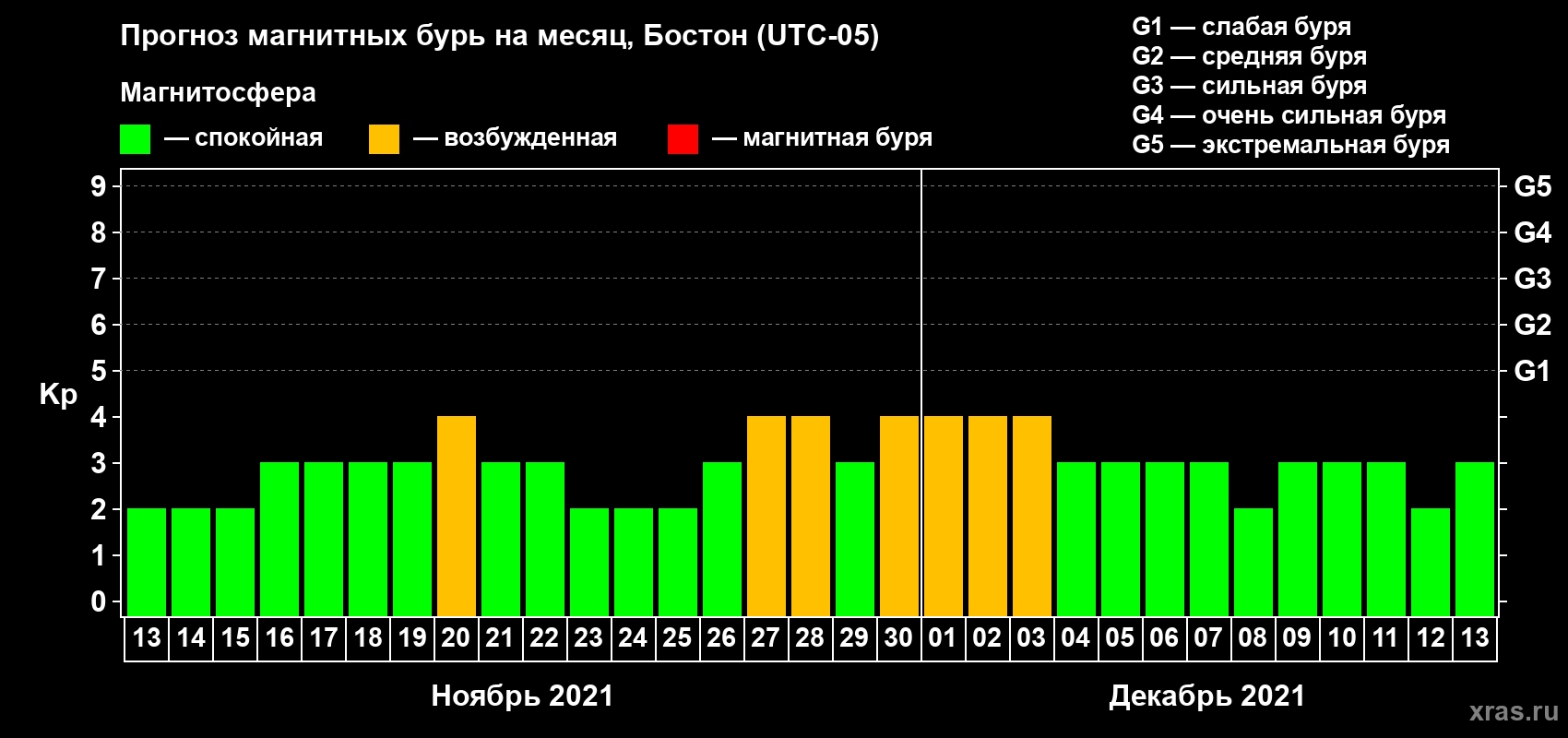 Прогноз магнитных бурь в Бостоне — 13 ноября 2021 года