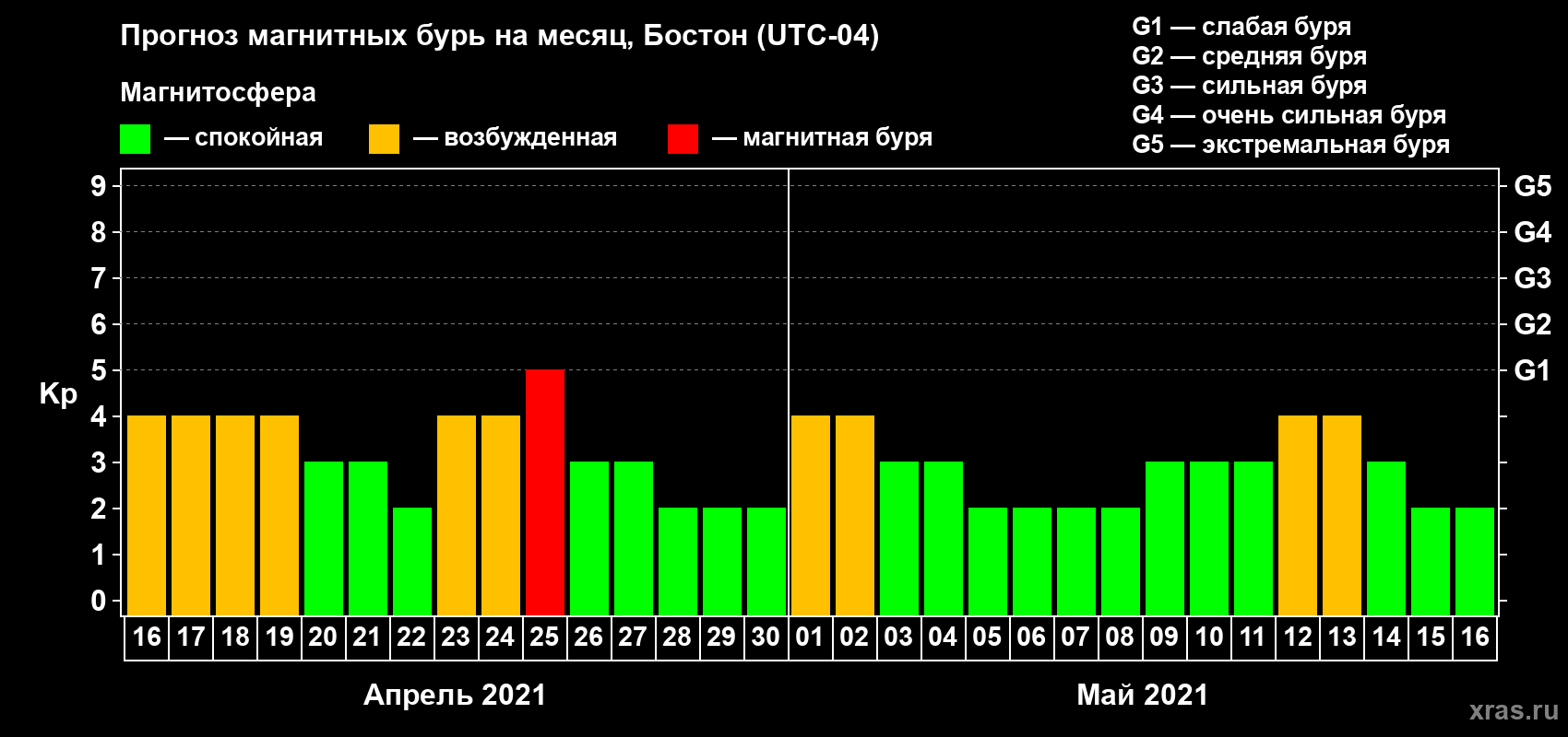 Прогноз магнитных бурь в Бостоне на 16 апреля 2021 года