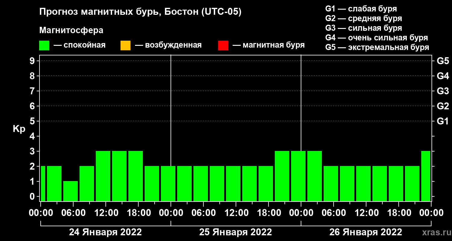 Прогноз магнитных бурь в Бостоне на 24 января 2022 года
