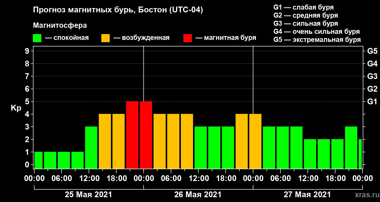 Прогноз магнитных бурь в Бостоне — 25 мая 2021 года