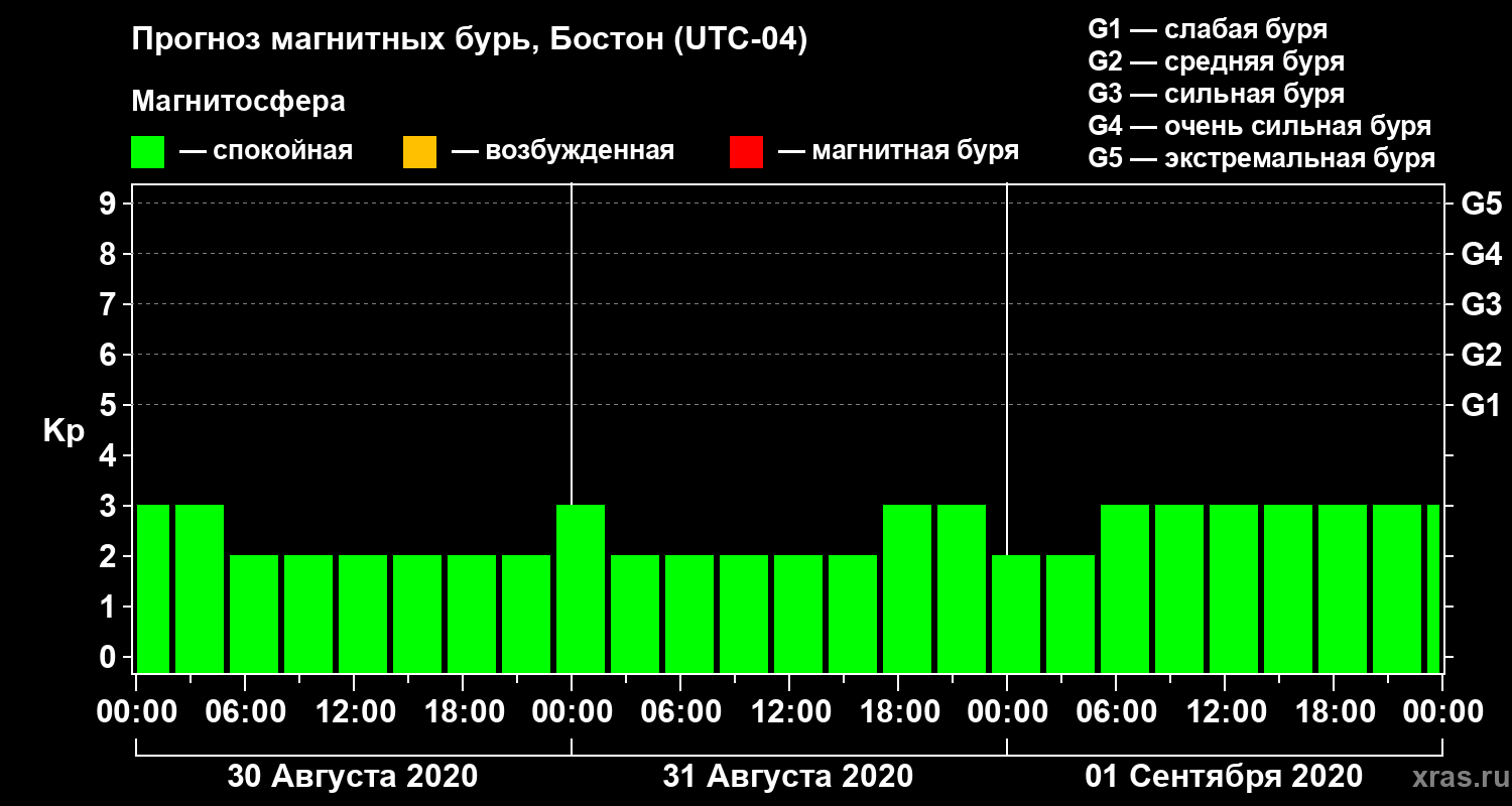 Прогноз магнитных бурь в Бостоне на 30 августа 2020 года