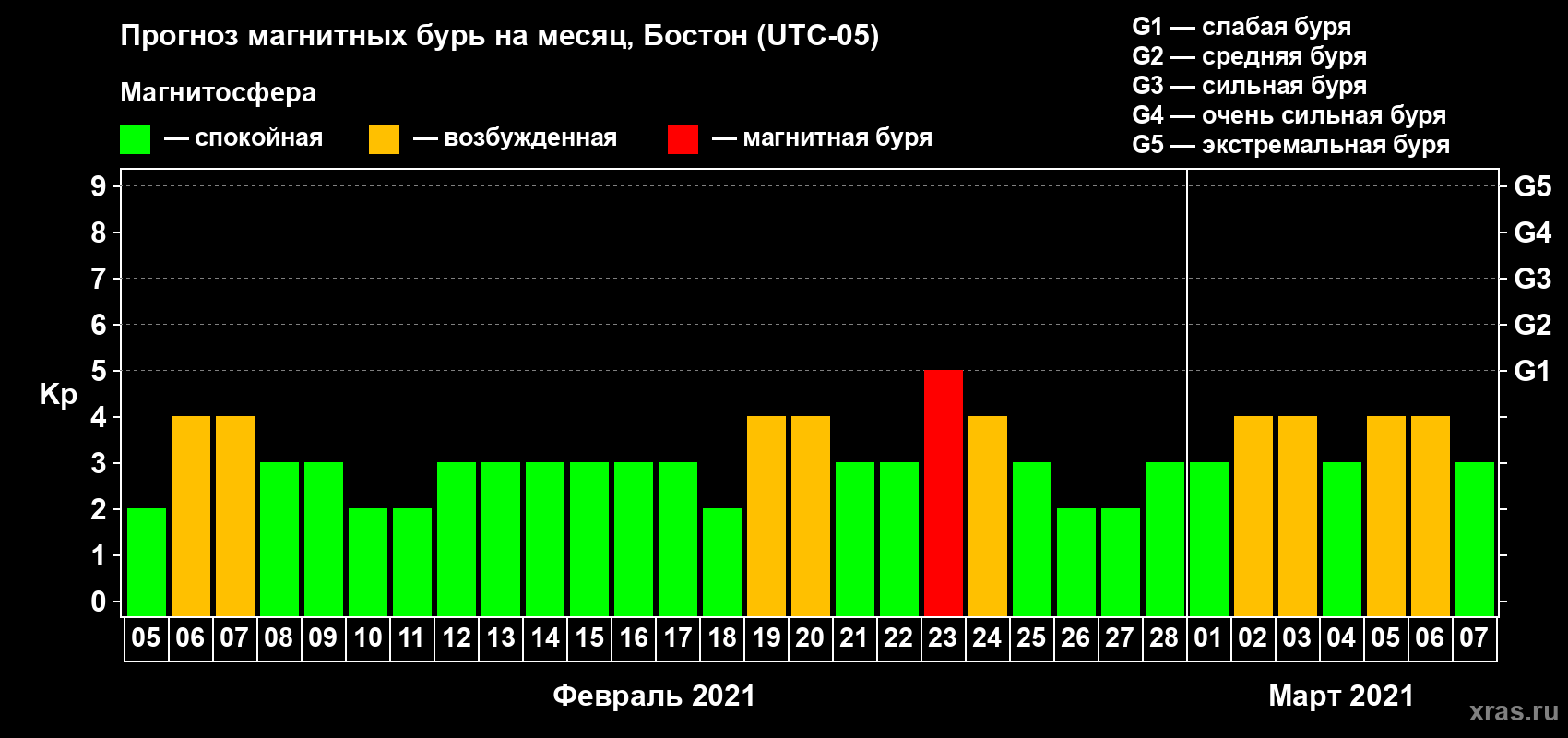 Прогноз магнитных бурь в Бостоне на 5 февраля 2021 года
