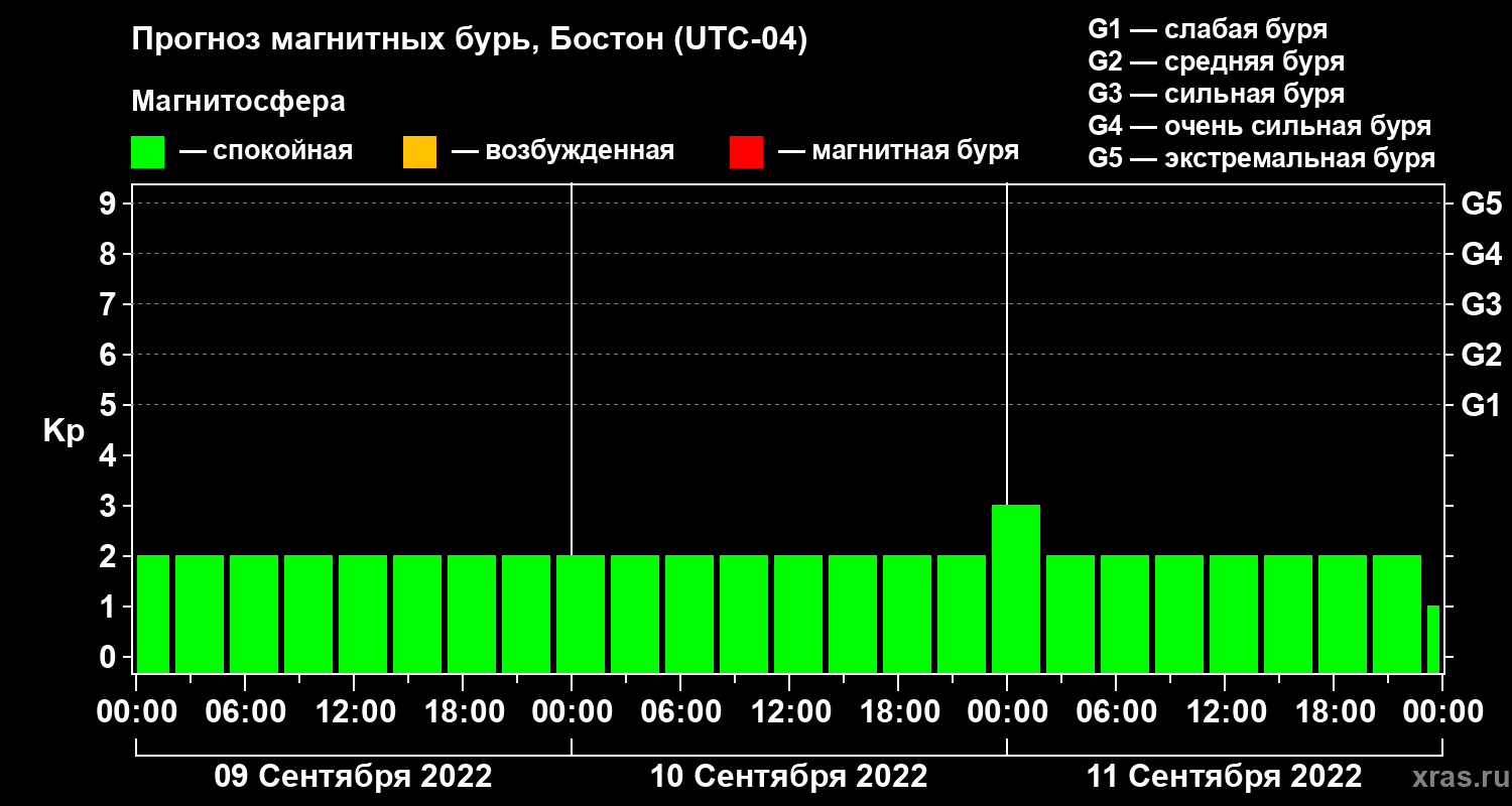 Прогноз магнитных бурь в Бостоне на 9 сентября 2022 года