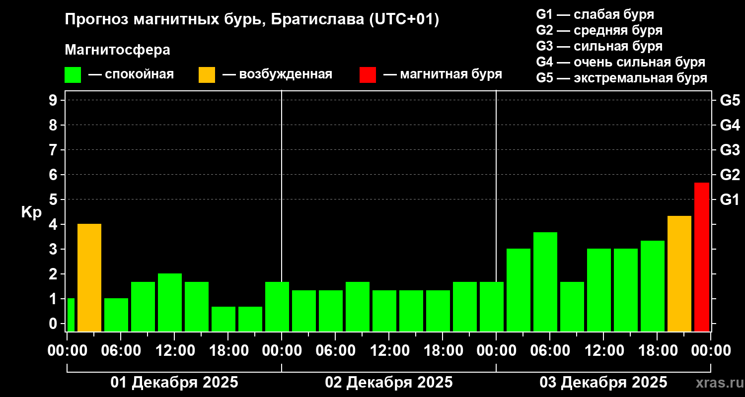 Прогноз магнитных бурь в Братиславе — 1 декабря 2025 года