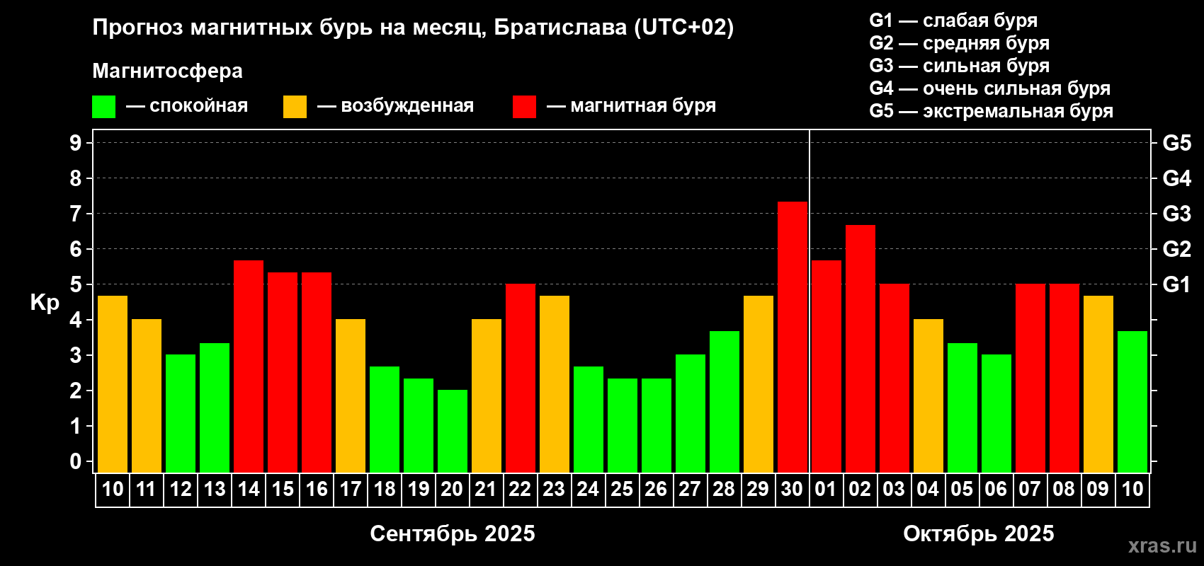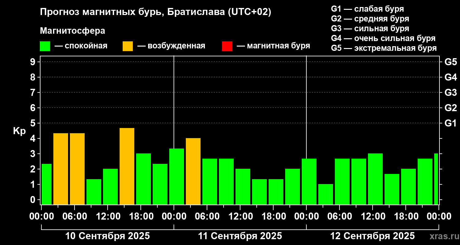 Прогноз магнитных бурь в Братиславе — 10 сентября 2025 года