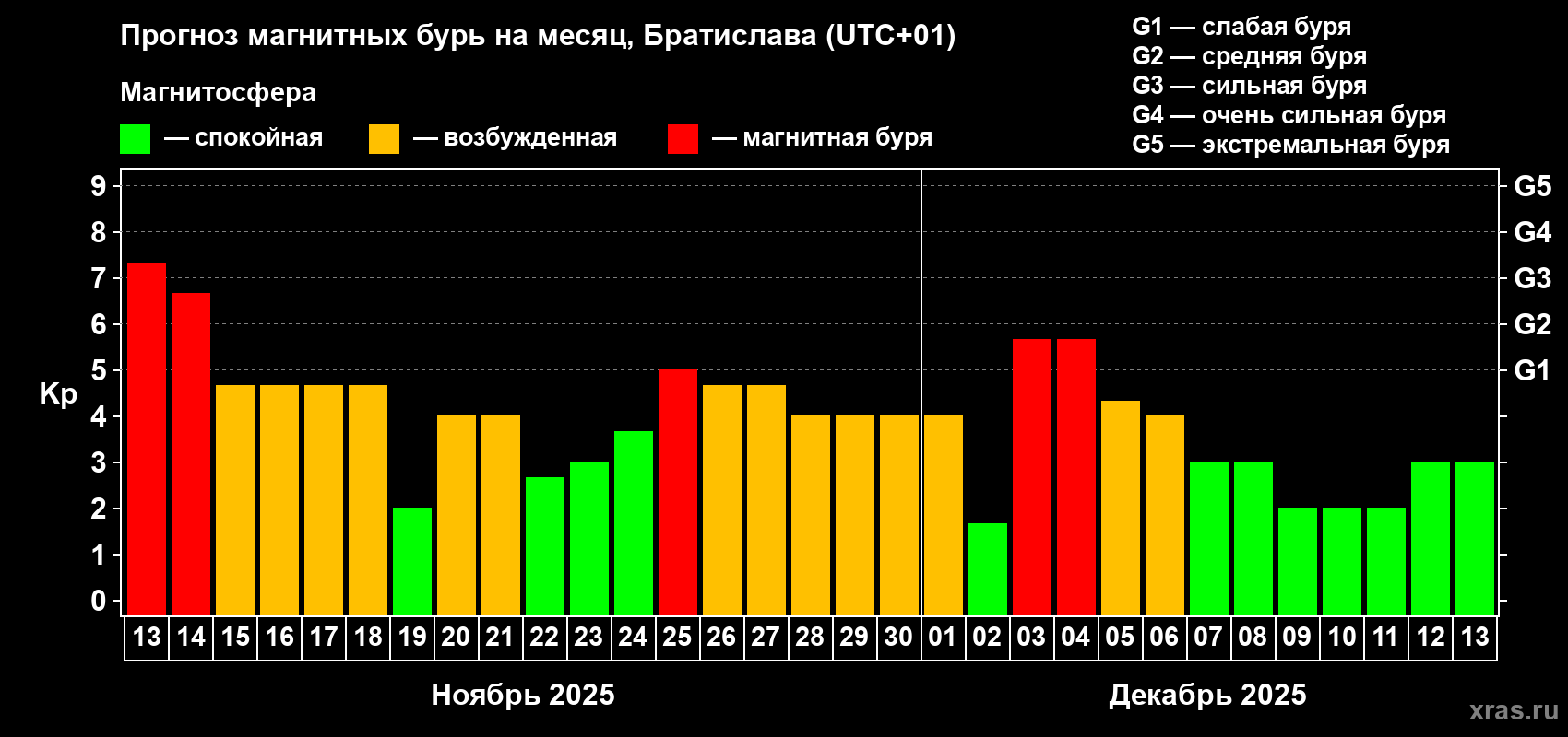Прогноз магнитных бурь в Братиславе — 13 ноября 2025 года