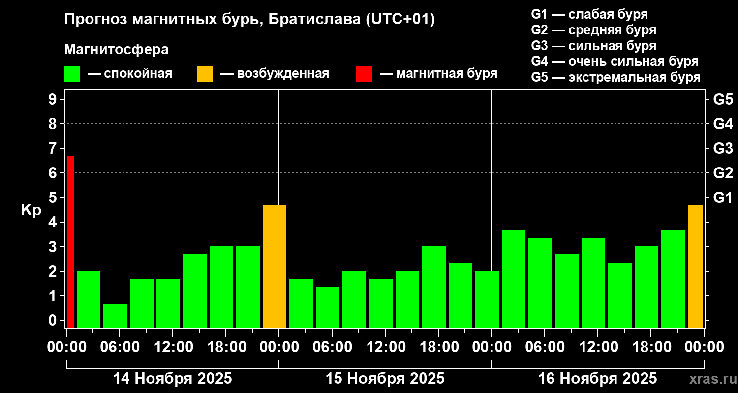 Прогноз магнитных бурь в Братиславе — 14 ноября 2025 года