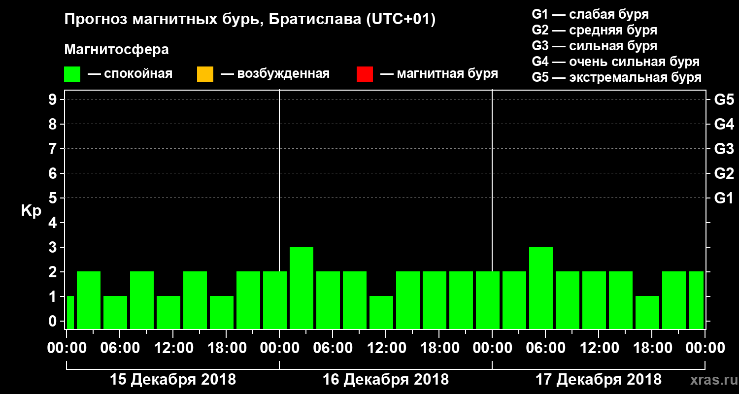 Прогноз магнитных бурь в Братиславе — 15 декабря 2018 года