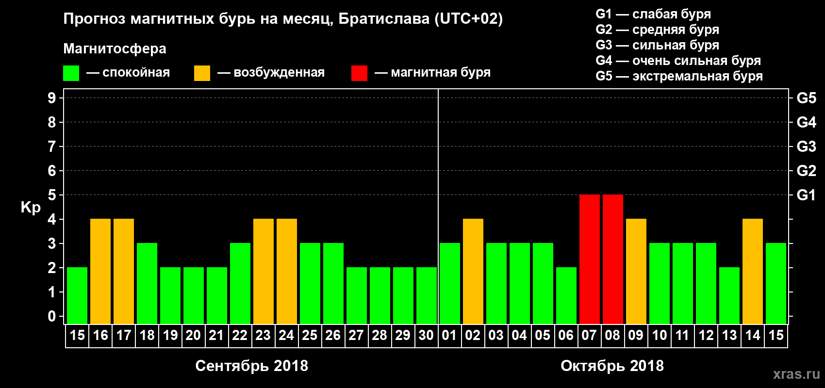 Прогноз магнитных бурь в Братиславе — 15 сентября 2018 года