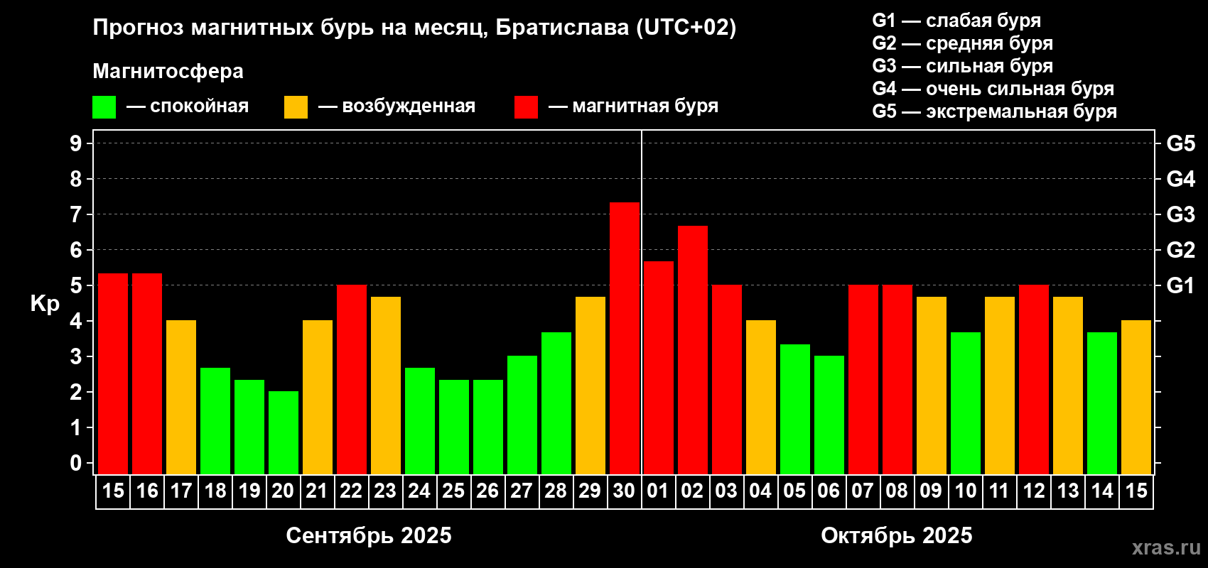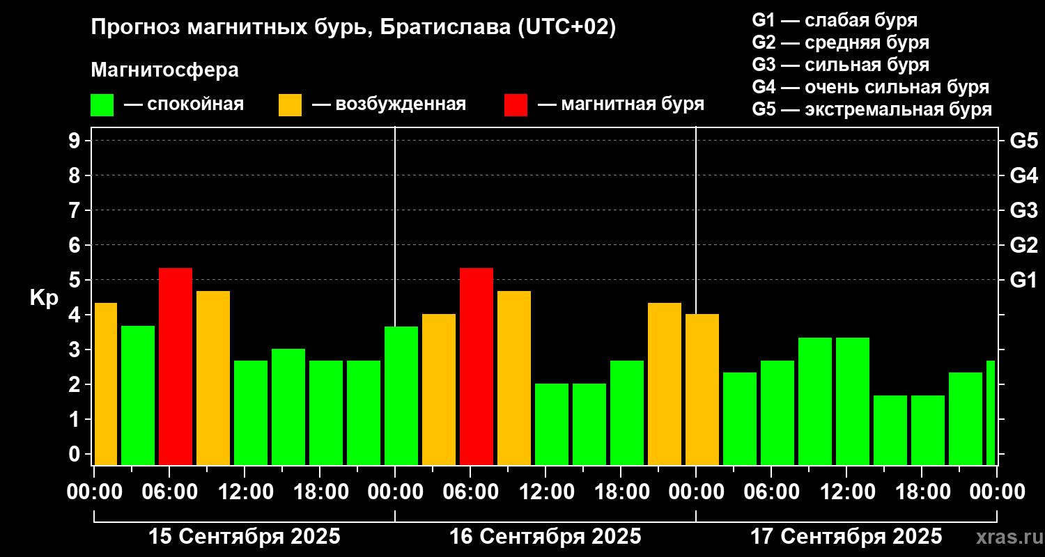 Прогноз магнитных бурь в Братиславе — 15 сентября 2025 года