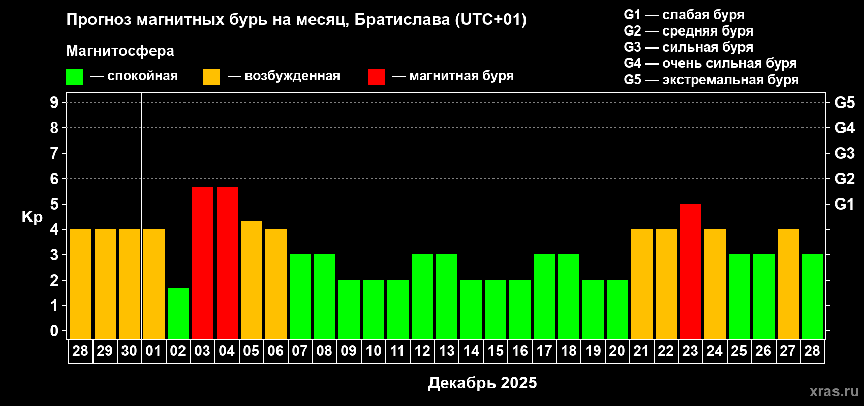 Прогноз магнитных бурь в Братиславе — 28 ноября 2025 года