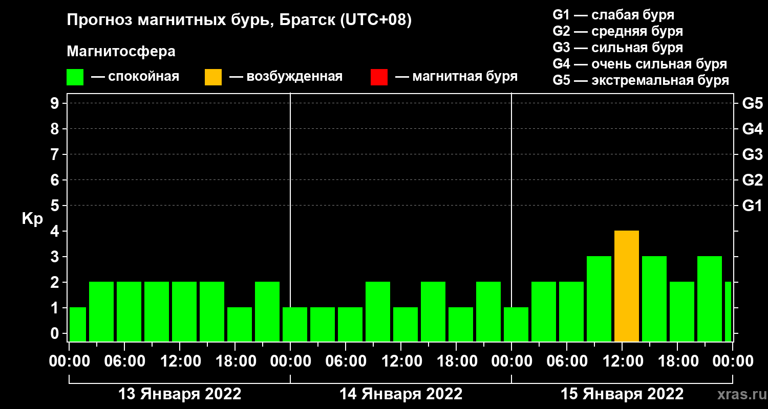 Прогноз магнитных бурь в Братске на 13 января 2022 года