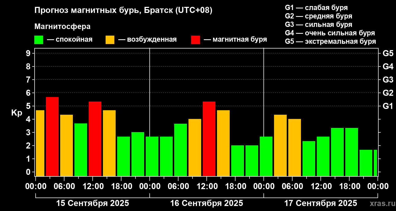 Прогноз магнитных бурь в Братске — 15 сентября 2025 года