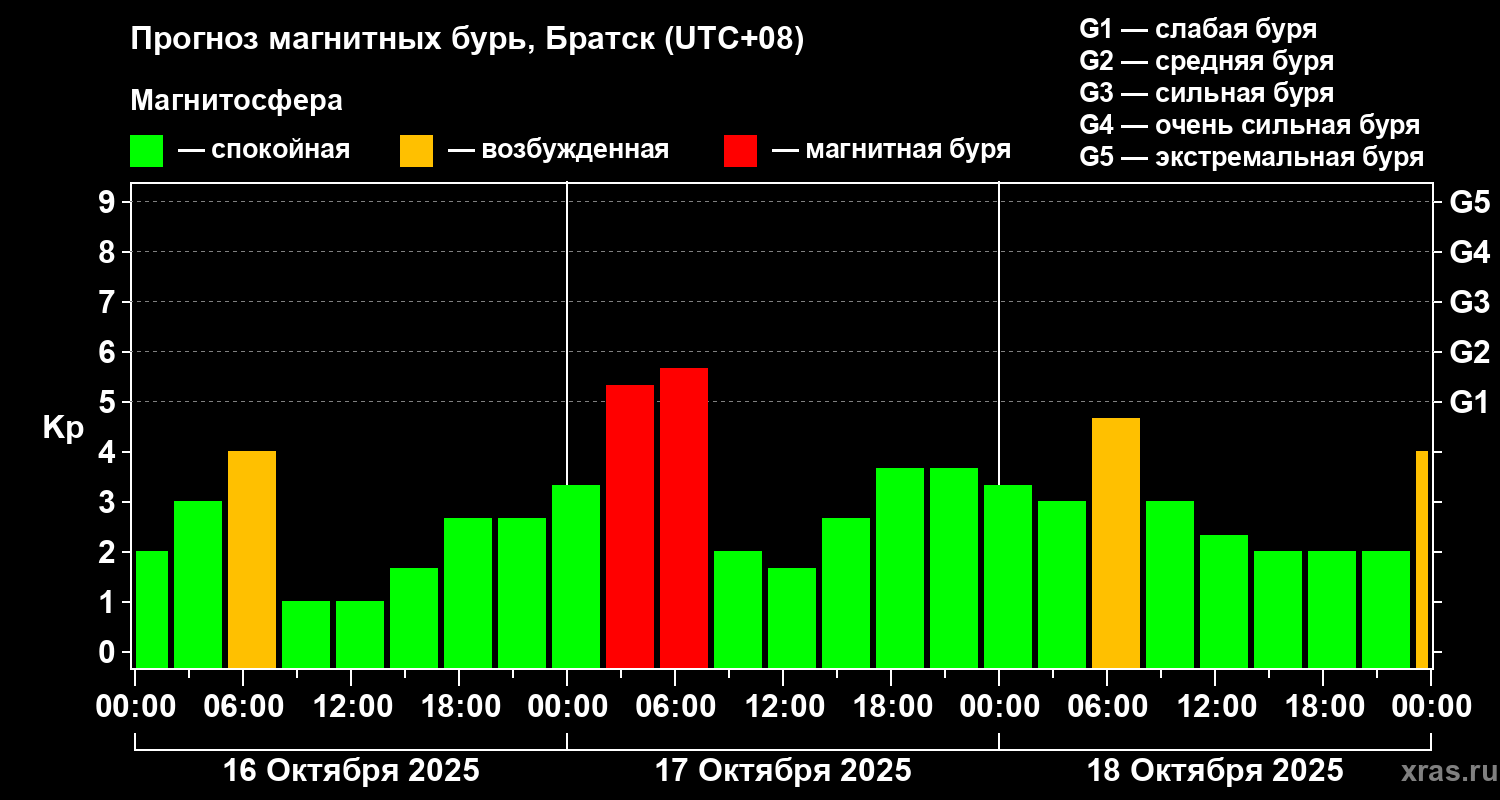 Прогноз магнитных бурь в Братске — 16 октября 2025 года