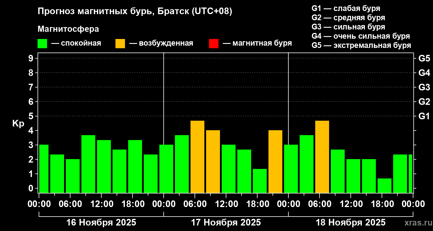 Прогноз магнитных бурь в Братске — 16 ноября 2025 года