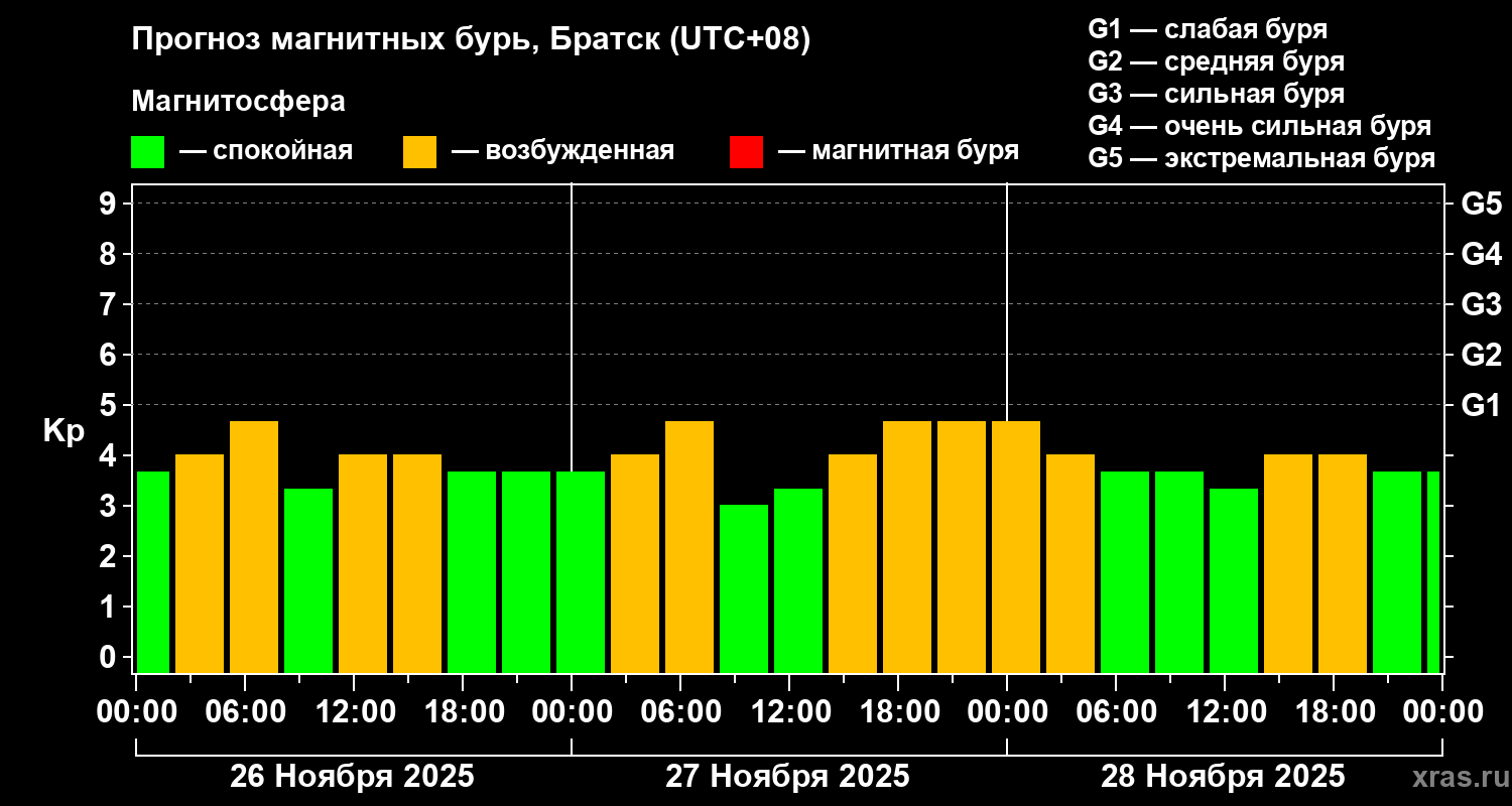 Прогноз магнитных бурь в Братске на 26 ноября 2025 года