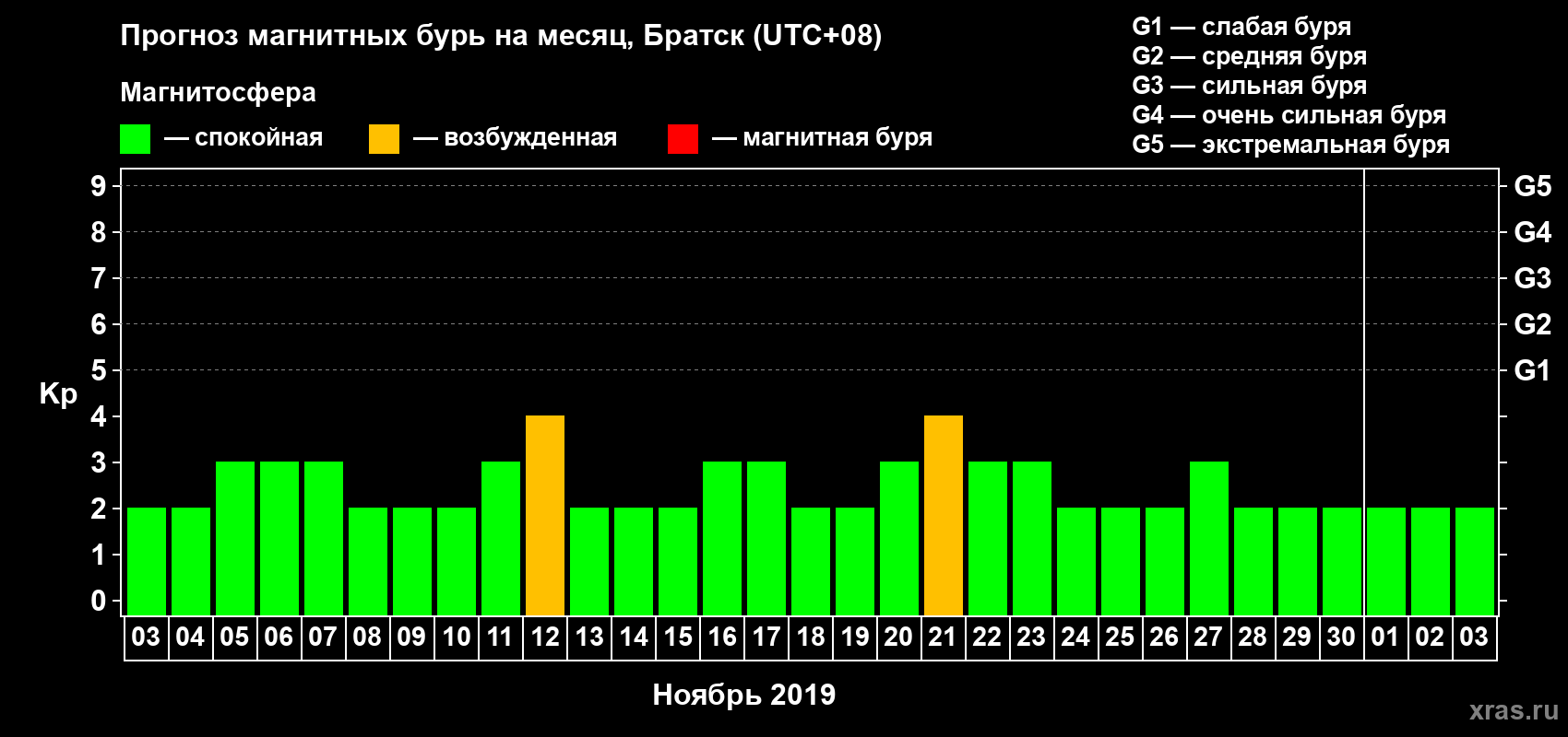 Прогноз магнитных бурь в Братске — 3 ноября 2019 года