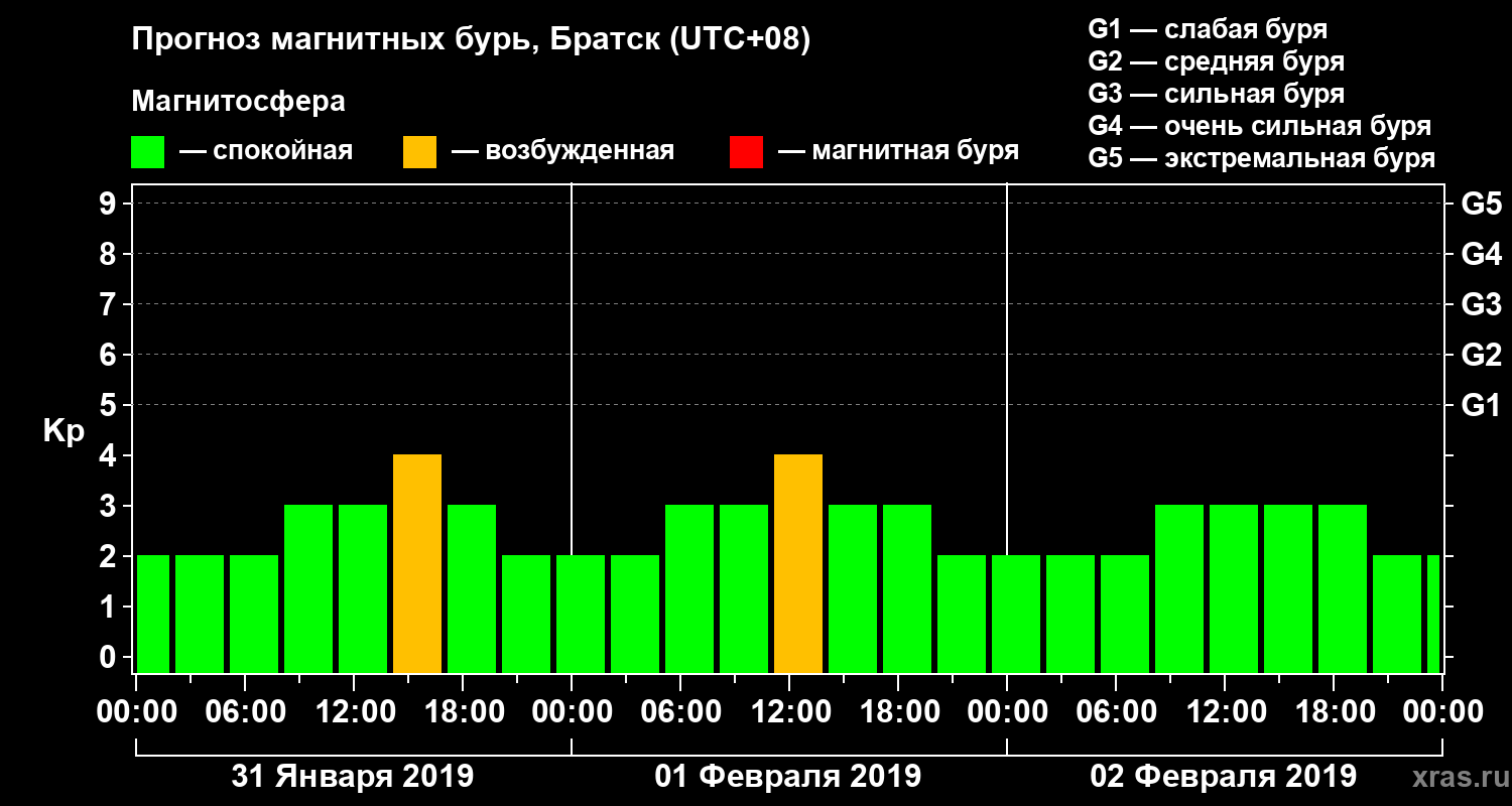 Прогноз магнитных бурь в Братске на 31 января 2019 года