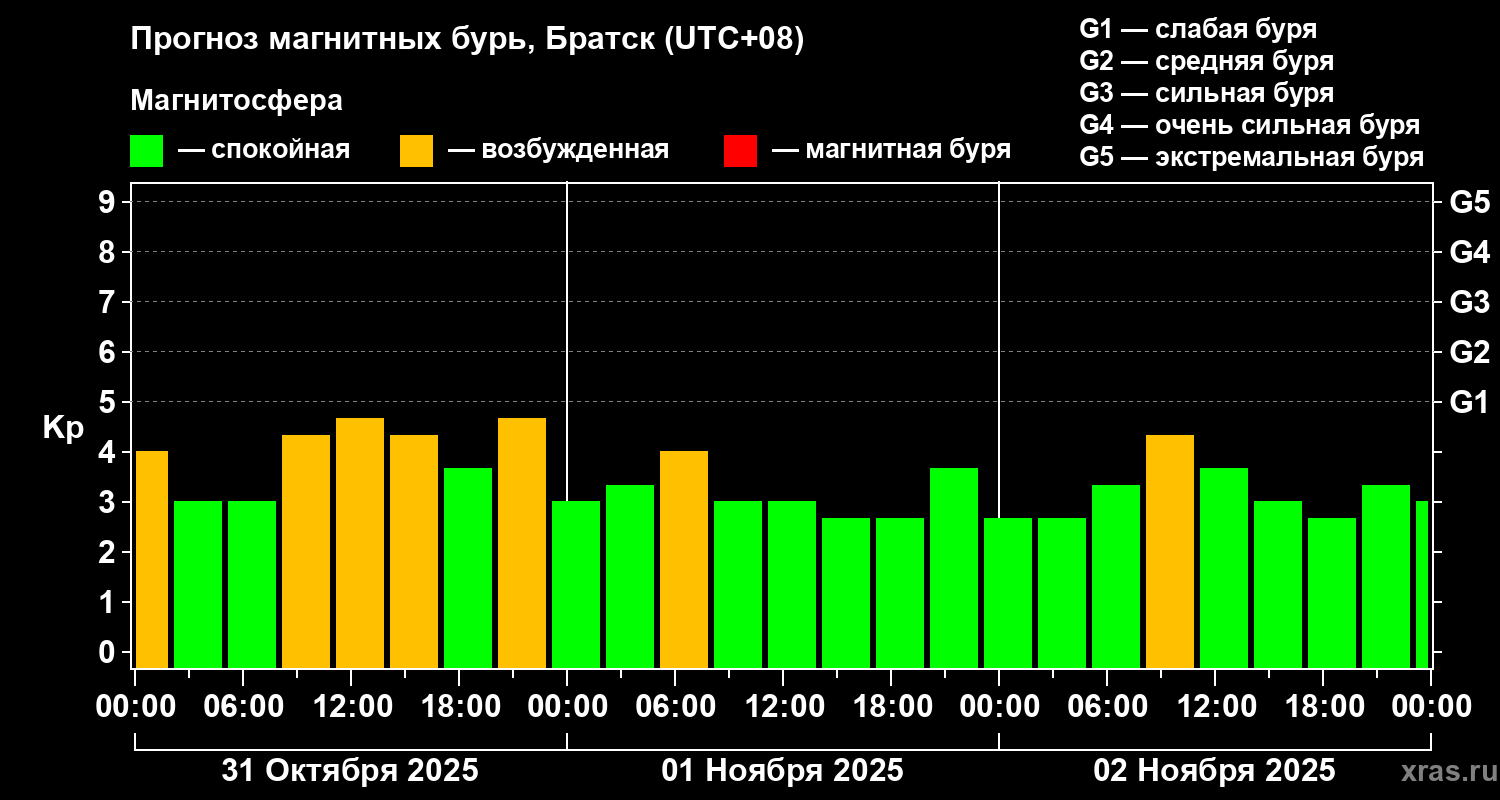 Прогноз магнитных бурь в Братске — 31 октября 2025 года