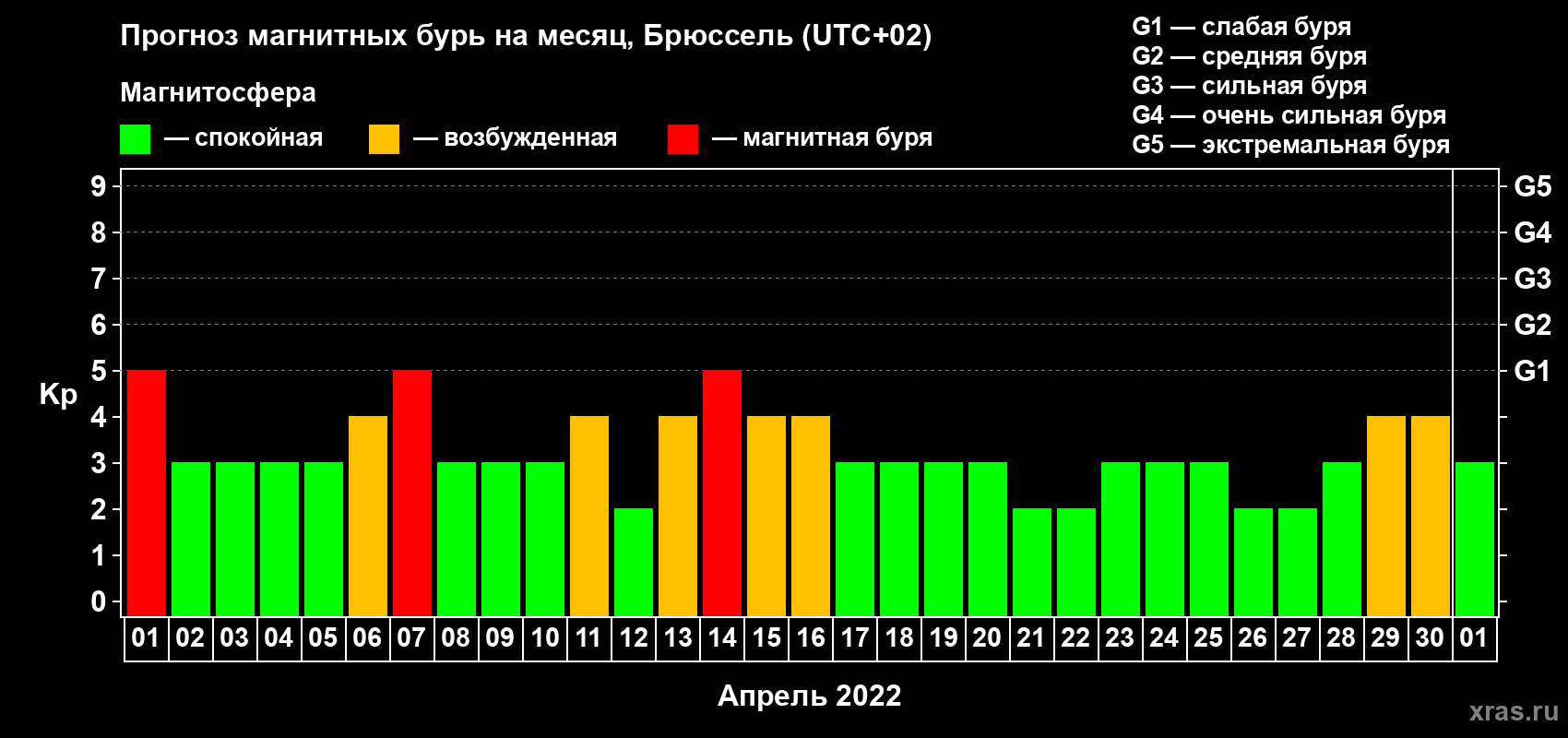 Прогноз магнитных бурь в Брюсселе на 1 апреля 2022 года