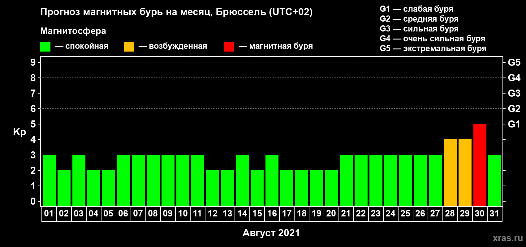 Прогноз магнитных бурь в Брюсселе на 1 августа 2021 года