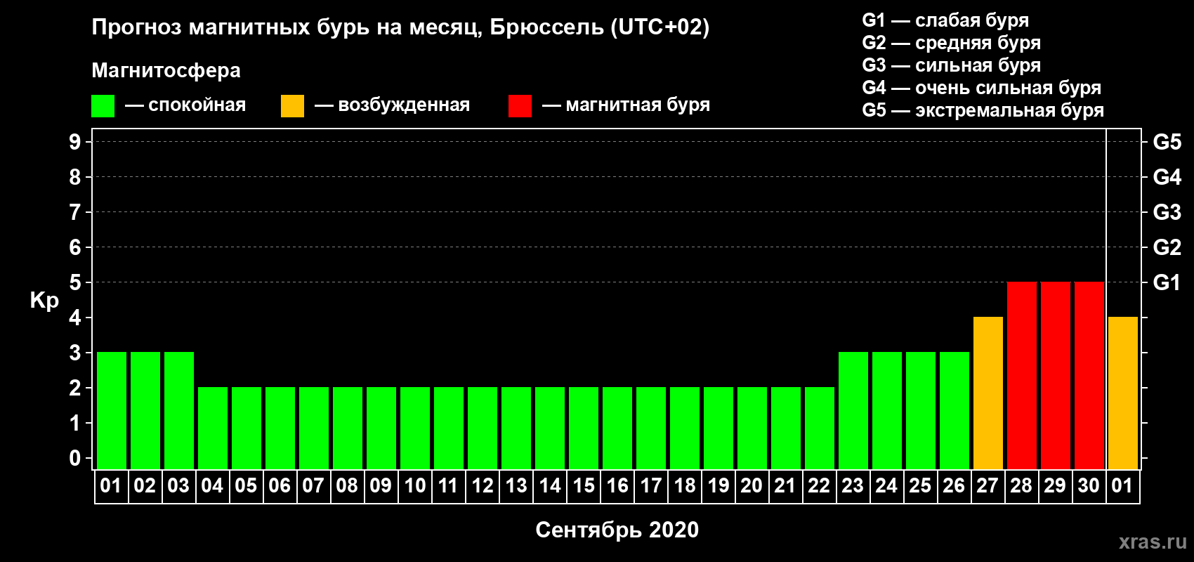 Прогноз магнитных бурь в Брюсселе — 1 сентября 2020 года