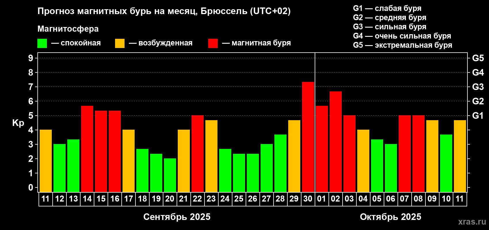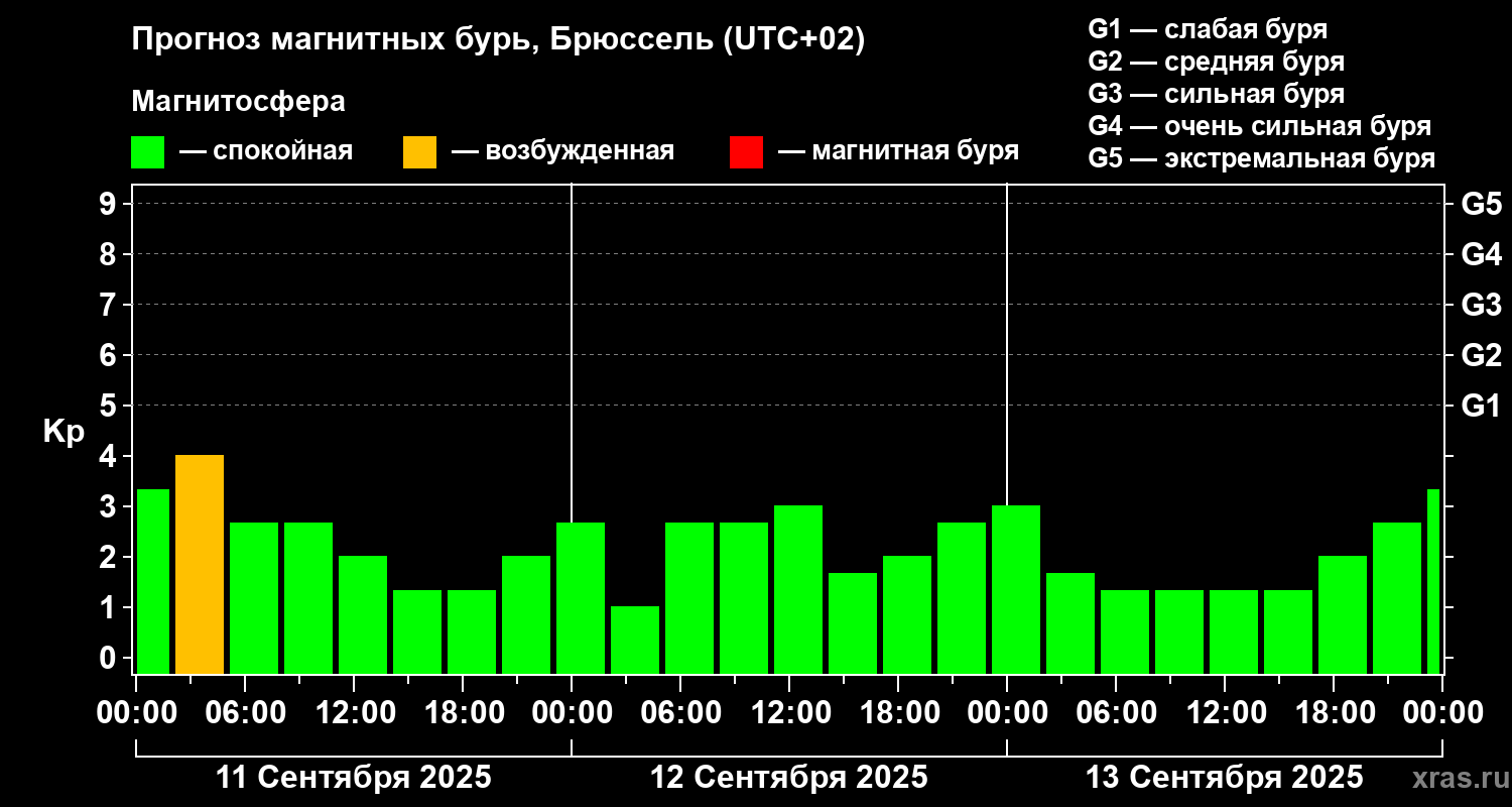 Прогноз магнитных бурь в Брюсселе — 11 сентября 2025 года