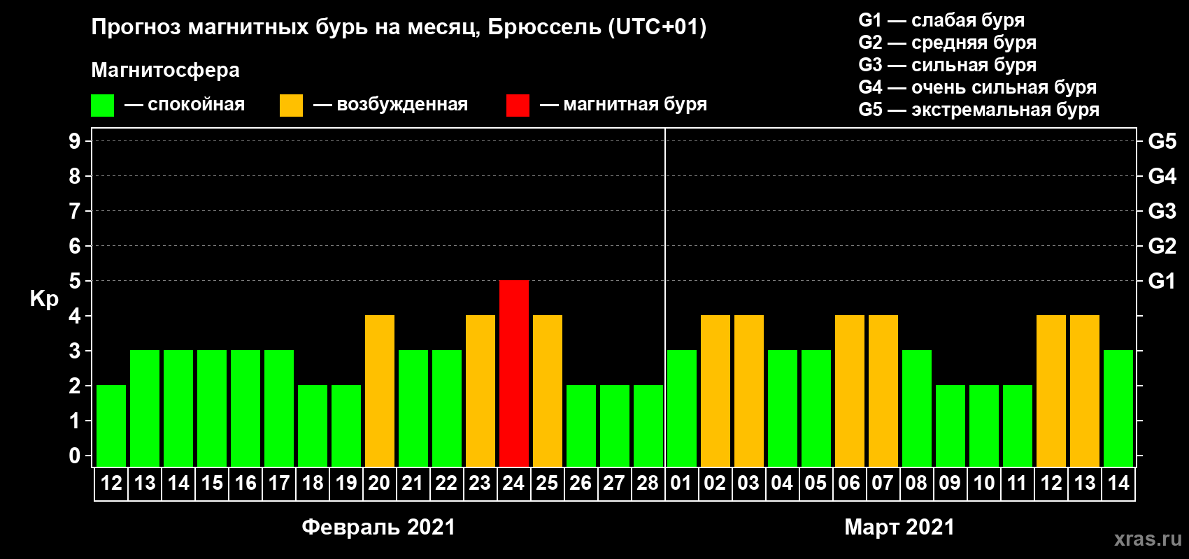 Прогноз магнитных бурь в Брюсселе — 12 февраля 2021 года