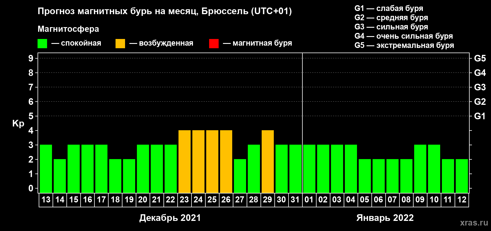 Прогноз магнитных бурь в Брюсселе — 13 декабря 2021 года