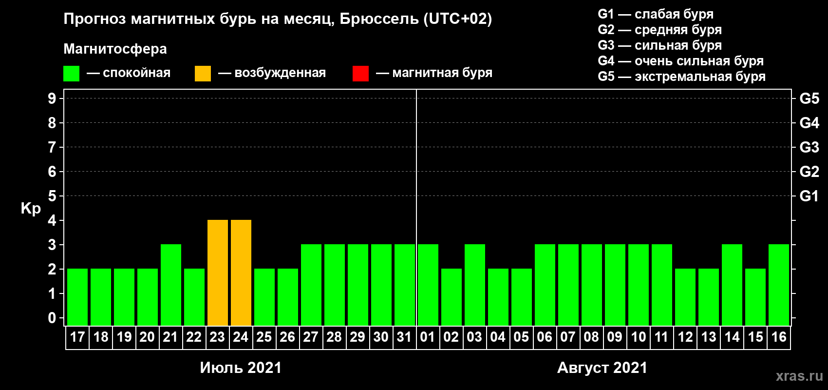 Прогноз магнитных бурь в Брюсселе на 17 июля 2021 года