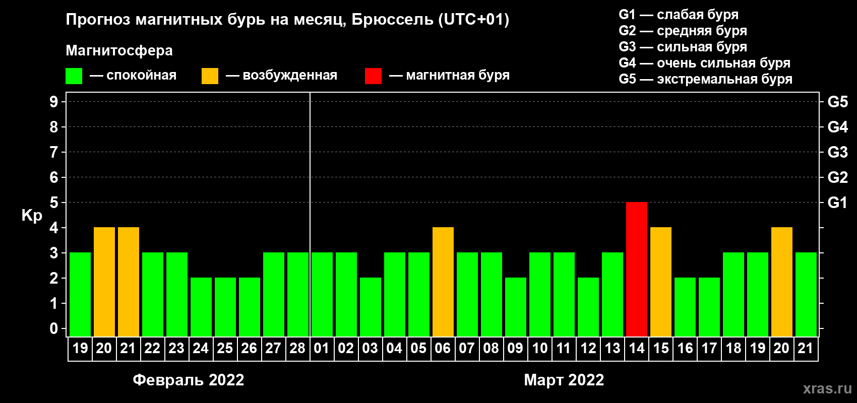 Прогноз магнитных бурь в Брюсселе — 19 февраля 2022 года